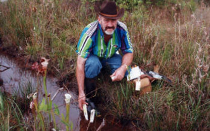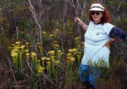 Tina in a field of Sarracenia leucophylla's on Bob Hanrahan's property at Elsanore, Baldwin County, Alabama, U.S.A.
