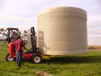 Our 2 x 50,000 litre water tanks arrive. We have had a lot of rain and the ground is very muddy. It took 4 hours to back the truck up the drive, unload and place the tanks. The 3 wheel, 4 WD forklift, kept getting bogged and had to be pulled with a tractor.